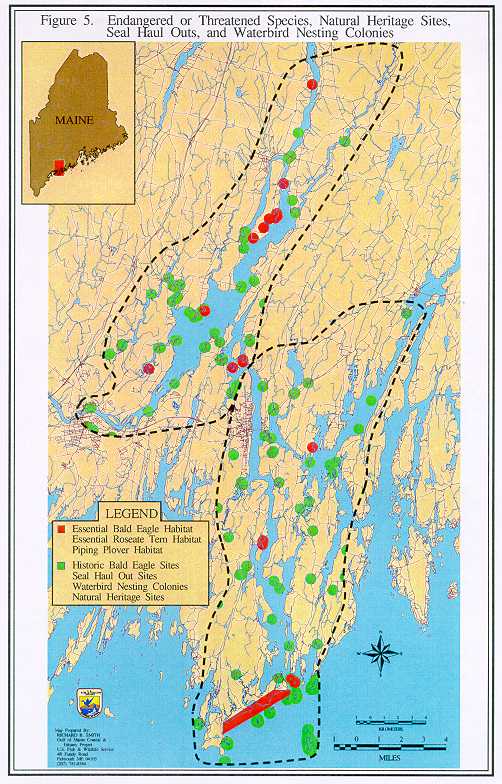 This map depicts: bald eagle and roseate tern essential habitats and historic bald eagle nest sites (MDIFW); piping plover habitats (USFWS); Natural Heritage Program sites (rare, threatened, and endangered species and communities); seal haul outs (University of Maine Wildlife Department and MDIFW); and waterbird nesting colonies (MDIFW and USFWS). A 402 meter (1320') radius buffer zone was calculated and mapped for each of the species. Essential bald eagle, essential roseate tern, and piping plover habitats are plotted in red while historic eagle nests, Heritage sites, seal haul outs, and waterbird sites are shown in green.