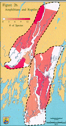The number of bird species for which indications of breeding were observed is shown for each USGS 7.5 minute quad of the focus area. Because the data are accumulated from inputs by a number of volunteers rather than a survey with consistent level of effort, the interpretation must be regarded with caution. This also applies to the herpetological data (below). The database was obtained from MDIFW (original source: Adamus, P.R. 1988. Atlas of Breeding Birds of Maine, 1978-1983. MDIFW, Augusta. 366pp.).