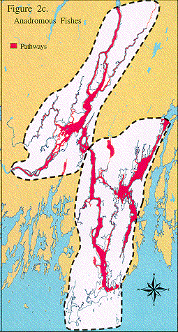 This figure displays open water habitat which corresponds to the upstream migratory pathways mapped for any of the nine anadromous fish species using the project area (Eipper, A., W. Knapp, and C. Laffin. 1982. Anadromous Fish Streams of New England: Upstream Migratory Routes. Portfolio NE-1. USFWS).