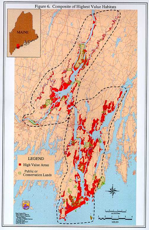 Our analysis of the fish and wildlife resources in the Merrymeeting Bay and Lower Kennebec River Focus Area is available to local, state, federal, and non-government organizations with common interests in habitat conservation. The entire Focus Area provides valuable habitat for fish and wildlife resources. The composite of highest value habitat (Figure 6) depicts areas where protection efforts should be focused for the Atlantic Coast Joint Venture of the North American Waterfowl Management Plan. Habitat protection strategies include conservation easements, land acquisition, agricultural incentives, conservation education, state and local environmental regulations, and zoning. Members of the MWPC, other conservation organizations, and private landowners may use this information to voluntarily implement specific protection measures. Following is a list and brief description of some of the cooperative initiatives and opportunities available for habitat protection in the Merrymeeting Bay and Lower Kennebec River Focus Area.