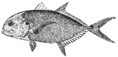 The presence of a well-developed first dorsal fin (8 spines) combined with an anal (about 17 rays, preceded by 2 short detached spmes) nearly as long as the second dorsal (about 20 rays), but no detached finlets, separates this particular jack from all other pompanos known from the Gulf, except the goggle-eyed scad (p. 377), hardtail (p. 376), and the saurel (p. 377). Its arched lateral line and the presence of (usually) two pairs of small but plainly visible canine teeth in the lower jaw distinguish it from the goggle eye; its naked breast and its canine teeth from the hardtail and saurel. The dorsal profile, too, of the head of the crevalle (fig. 200) is characteristic, and the long scimitar-shaped pectoral fins are a convenient field mark to separate it and other members of its immediate tribe,[64] from the pilotfish, rudderfish, and mackerel scad, in which the pectorals are short and blunter. We need only call attention further to its deeply forked tail; to the row of keeled shields along, either side of its caudal peduncle; to its flattened oblong form (body [page 376] only about two and one-half times as long as deep, but with caudal peduncle as slender as that of a mackerel), and to its blunt head.